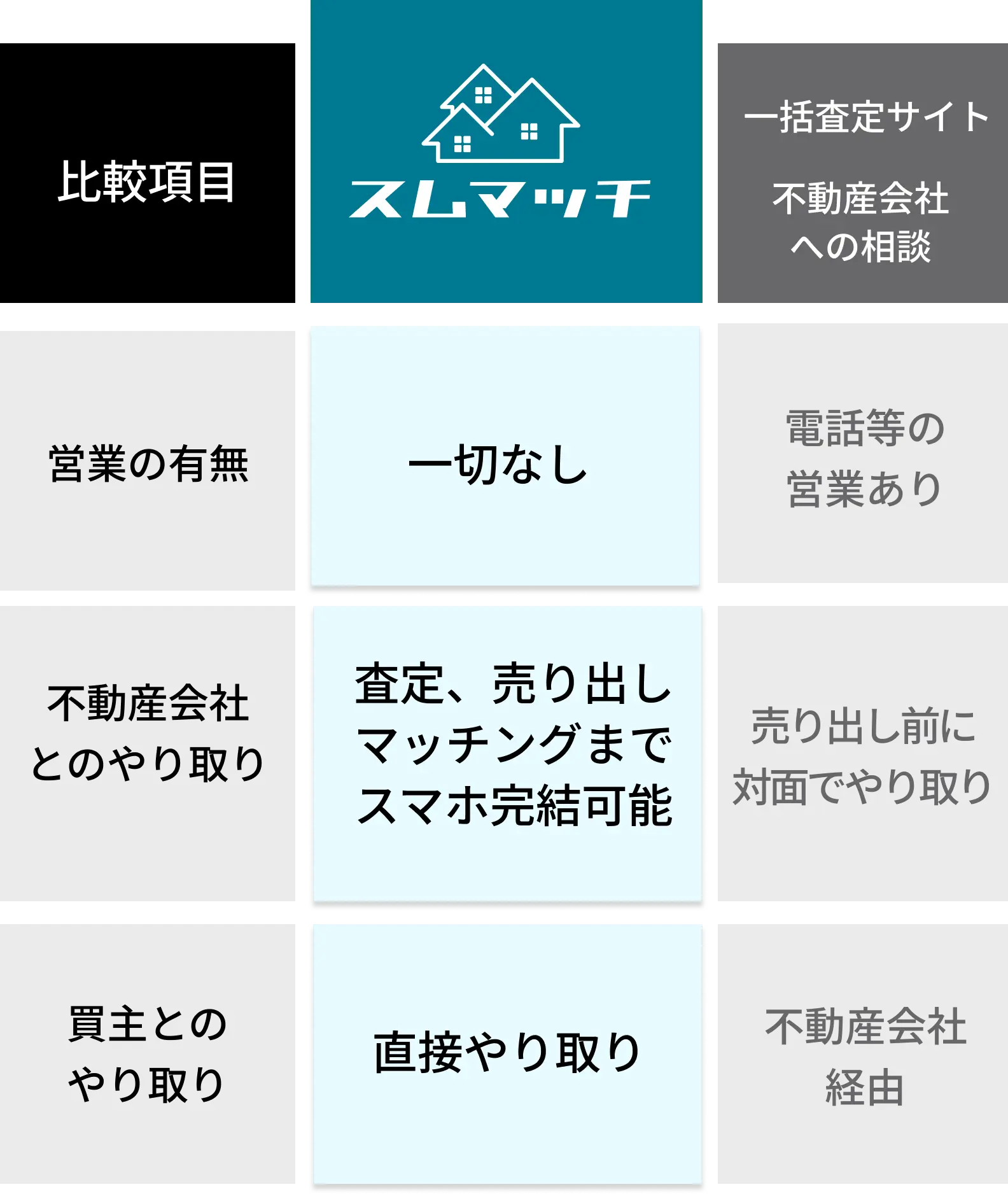 /買主の買いたい価格が分かる\ 一括査定を出したら、営業の電話が止まらなかった いきなり営業されるのが怖い 査定価格を聞いてみたいけど、 連絡がくるのが面倒 は、 そんなあなたの気持ちに 寄り添います。 自分の物件がいくらで売れるかを、スマホで気軽に確認 気になる価格がついたら、売るかどうかはその後でOK 面倒なやりとりや営業は一切なし まずはスムマッチに 気軽に出してみる そこからスタートです もちろん従来の不動産会社の 「売却」活動と併用できます。 (物件情報サイト、チラシなど) POINT 4つの安心ポイント お客様が売却を依頼する不動産会社を決めるまで個人情報が開示されることはありません。※媒介契約締結後、売却活動のサポートのために連絡先を開示いたします。 「売る」と決めていなくてもOK。まずはいくらで売れるかを知るそんな使い方も歓迎しています。 スムマッチの利用自体には一切費用がかかりません。※成約時に不動産会社への仲介手数料等が発生するのは、通常の取引と同様です スムマッチでは、買主からの価格交渉が売主に直接届く仕組みです。そのため、不動産会社が特定の買主からの申込みを意図的に隠したり、売主に伝えなかったりする「囲い込み」の心配がなく、透明性の高い取引が可能です。 まずは、あなたの物件が いくらで売れるか 試してみませんか? COMPARED 他社との比較 不動産売却の常識を覆す、スマホひとつで完結する新しいスタイルです。 MESSAGE 創業者の思い 私が不動産業界で10年以上、毎年、友人や知人から「自宅を売りたいけど、どうすればいいか…」という相談を数多く受けてきました。その度に感じてきたのは、不動産売却は依然として不動産会社への直接の相談が主であり、一括査定サイトは気軽に査定依頼ができる反面、受注目的の相場離れした査定や、しつこい営業電話に多くの人がストレスを抱えているという現実です。 不動産売却は、人生の大きな節目。その大切な決断を、不透明な仕組みや不快な営業活動によって曇らせてはいけない。「査定価格を知りたいけど、営業電話が怖くて一歩踏み出せない」 「売るかどうかも決めていないのに、電話や面談のプレッシャーは避けたい」そうした声に応えるため、スマホ一つで買いたい人を探し、不動産会社の査定に頼らずに、あなたのペースで売却活動ができるサービス「スムマッチ」を立ち上げました。私たちは、売却活動におけるストレスをなくし、あなたが納得できる形で前に進むことを心から願っています。 FAQ よくある質問 Q1. スムマッチは無料で使えますか? はい、すべて無料でご利用いただけます。※ただし、不動産取引において通常発生する費用(仲介手数料など)はかかります。 Q2. 不動産会社からの営業はありますか? 一切ありません。お客様が不動産会社と媒介契約を締結するまで、電話番号やメールアドレスなどの連絡先は開示されません。 Q3. 売らないといけませんか? いいえ。売れる価格を確認した上で、売却するかどうかをご判断いただけます。 Q4. スムマッチでしか、売却活動が できないのですか? スムマッチだけでなく、契約を締結した不動産会社が他のツール(物件情報サイト、チラシ等)での売却活動も行います。今までの売却活動に加え、スムマッチという新たなツールが加わった形です Q5. スムマッチ上で売却活動が完結しますか? スムマッチ上で物件査定→媒介契約→売出開始→マッチング(内覧調整)が完結します。 その後の内覧から契約は不動産会社がサポートしてくれます。 Q6. 登録できる物件の種類は? マンション、一戸建て、土地が登録可能です。複数物件の登録もできます。 いま、売るかどうかは決めなくていい。まずは いま売れる価格 を 知るところから。 あなたのスマホに、 買主からのリアルな希望価格が届く。まずは気軽に、 スムマッチを体験してみませんか? 株式会社TIME IS(運営会社)東京都渋谷区渋谷2-19-19 info@timeis.co.jp プライバシーポリシー/運営会社 © 2025 TIME IS Inc. All Right Reserved.